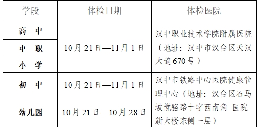 体检时间、医院和学段安排
