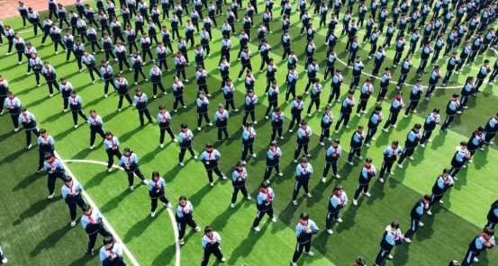伴随着舒缓悠扬的古琴曲,千余名师生凝神静气,缓缓起势。只见他们双臂徐徐抬起,掌心向上,指尖相对,一招“双手托天理三焦”将身体舒展到极致;阳光下,师生们的动作整齐如一人,一招一式柔和连贯、松紧有致,将八段锦“意动形随、神形兼备”的独特韵味展现得如诗如画。
