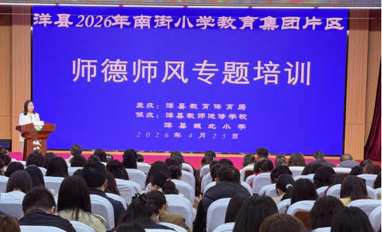 2026年4月25日,洋县首轮师德师风集中面授培训圆满结束。洋县中学、贯溪初中教育集团、南街小学教育集团三个不同学段的870余名一线教师分布在三个会场参加培训。3名本土专家和6名身边榜样登台授课分享,现场反响热烈,效果显著,深受参训教师好评。