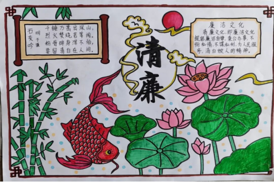 活动中,学校组织全体教师开展“廉洁从教”专题活动,通过专题学习等形式,强化教师廉洁自律意识,引导教师以身作则、为人师表,以清正师风引领学生健康成长。各班积极开展“清廉故事会”、制定班级公约等主题班会活动,引导学生从身边小事做起,践行诚实守信、勤俭节约的价值观,让清廉意识在班级落地生根。并组织学生开展“童心绘廉”手抄报创作活动,一幅幅主题鲜明、创意十足的作品,将莲花、翠竹等象征清廉的意象生动呈现,展现了孩子们对廉洁美德的向往与追求。