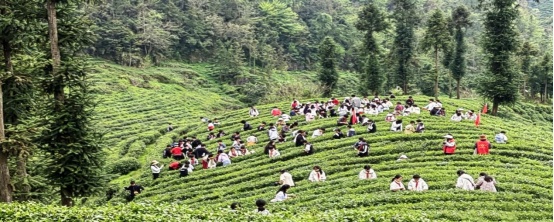清晨的茶园薄雾轻绕,层层叠叠的茶垄顺着山势绵延,鲜嫩的茶芽在春光中吐露生机,满溢清新茶香。抵达采摘区域后,孩子们满怀期待地走进茶园,化身小小“茶农”,分散在葱郁的茶树间。在工作人员的细致讲解下,大家掌握了“一芽一叶”的采摘技巧,纷纷伸出小手,小心翼翼地撷取枝头嫩芽,指尖轻捻、轻放,鲜嫩的茶芽缓缓落入腰间竹篓。孩子们时而低头专注采摘,时而与小伙伴比拼收获,清脆的笑声回荡在茶园之中,劳动的喜悦、春日的美好在指尖尽情流淌。