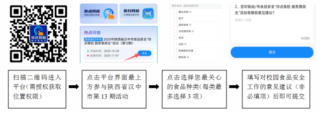 为切实保障校园及其周边食品安全,让孩子们吃得安心、家长放心,诚挚邀请全市广大师生及家长,通过陕西省市场监管局“你点我检服务民生”平台,参与校园食品安全“你点我检”及“我为食品安全提意见”问卷调查活动,勾选您最关心的食品品种,提出您的意见,由市场监管部门开展抽检,并在官方网站或媒体平台集中公示抽检结果,依法核查处置不合格食品。(汉中市学生资助管理中心)